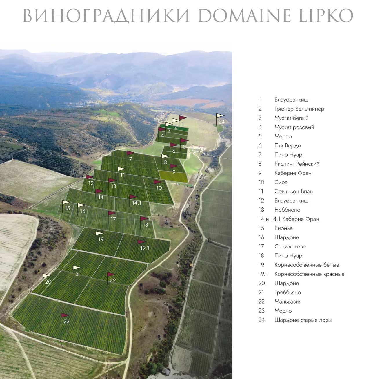 Все вина Domaine Lipko выпускает из собственного винограда, выращенного в севастопольском терруаре. В распоряжении компании — тридцатипятилетние лозы Каберне Совиньон и Шардоне, а также 40 га международных сортов, высаженных в 2018 году: Мерло, Сира, Каберне Фран, Мальвазия, Санджовезе, Треббьяно, Неббиоло, и др. Кроме того, винодельня уделяет много внимания селекции и сохранению аборигенных крымских и кубанских виноградных сортов.