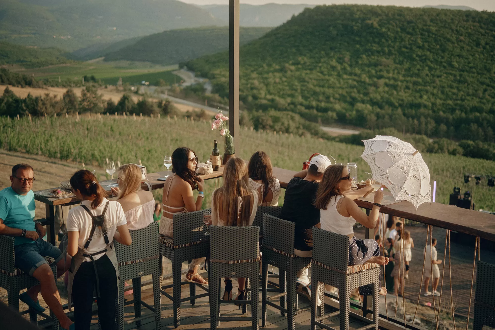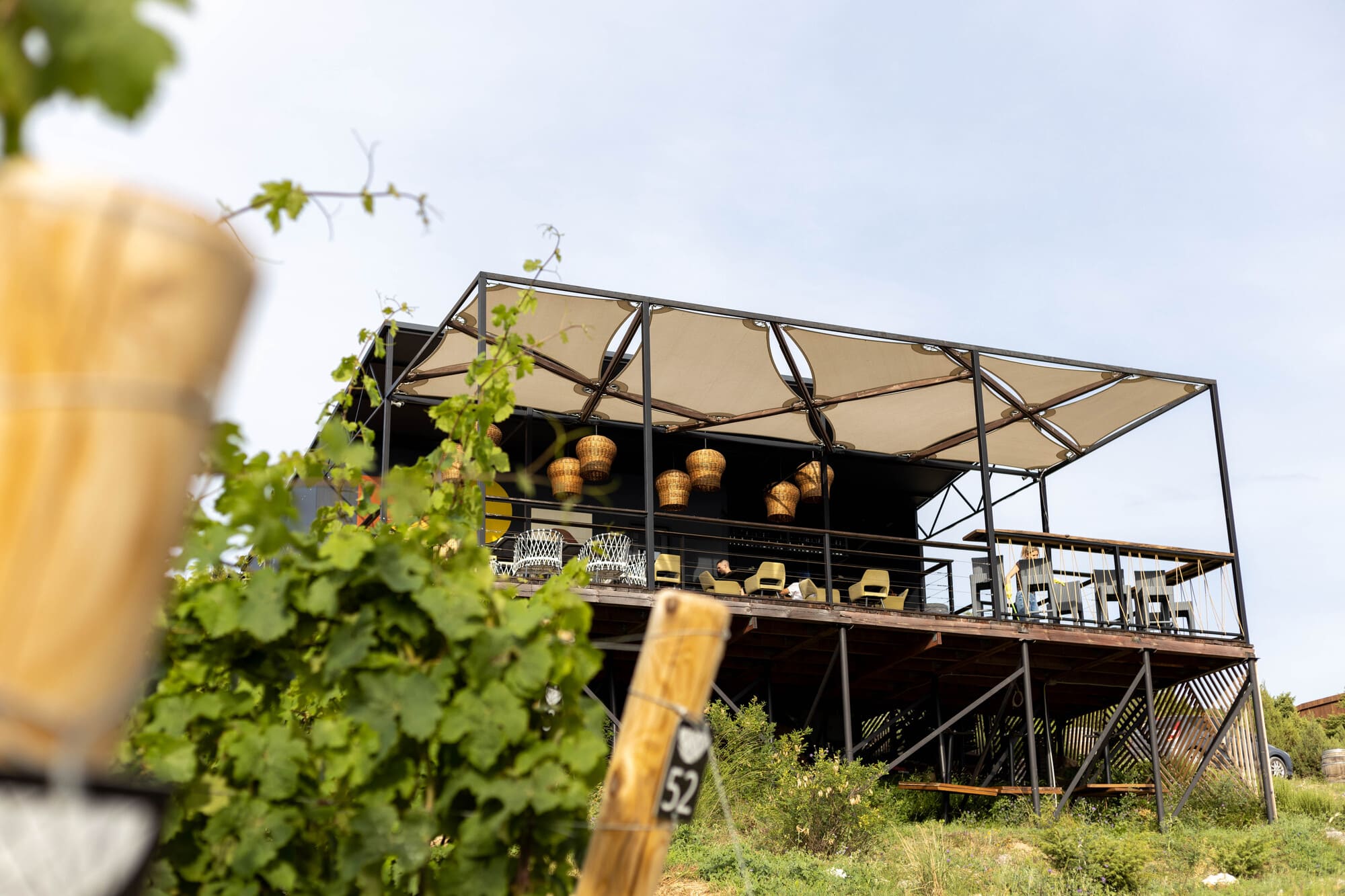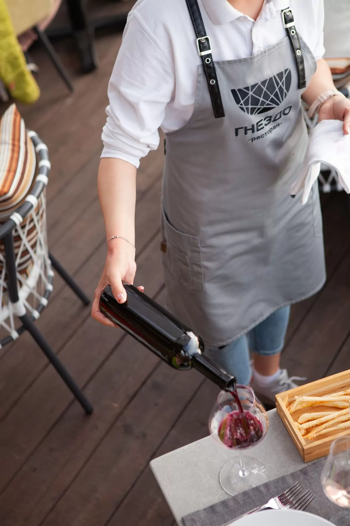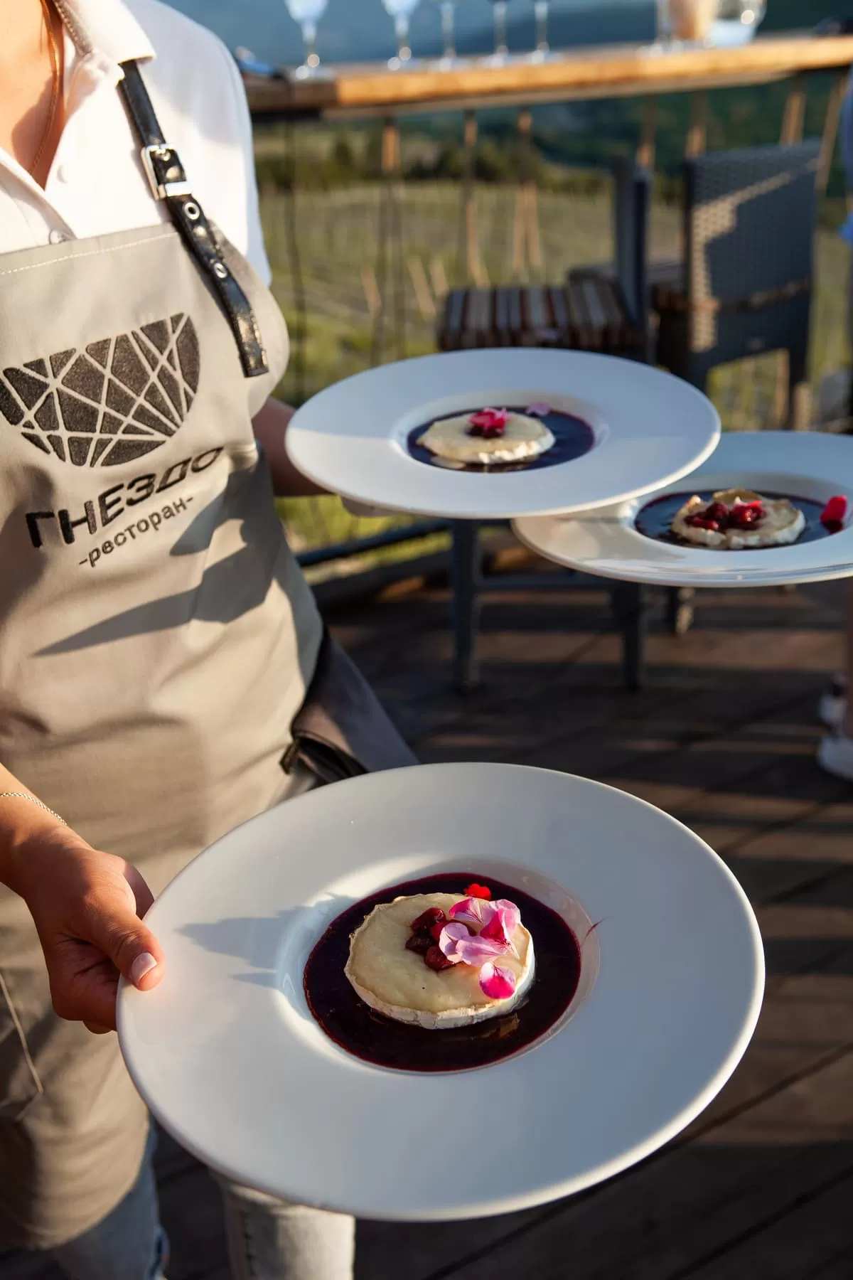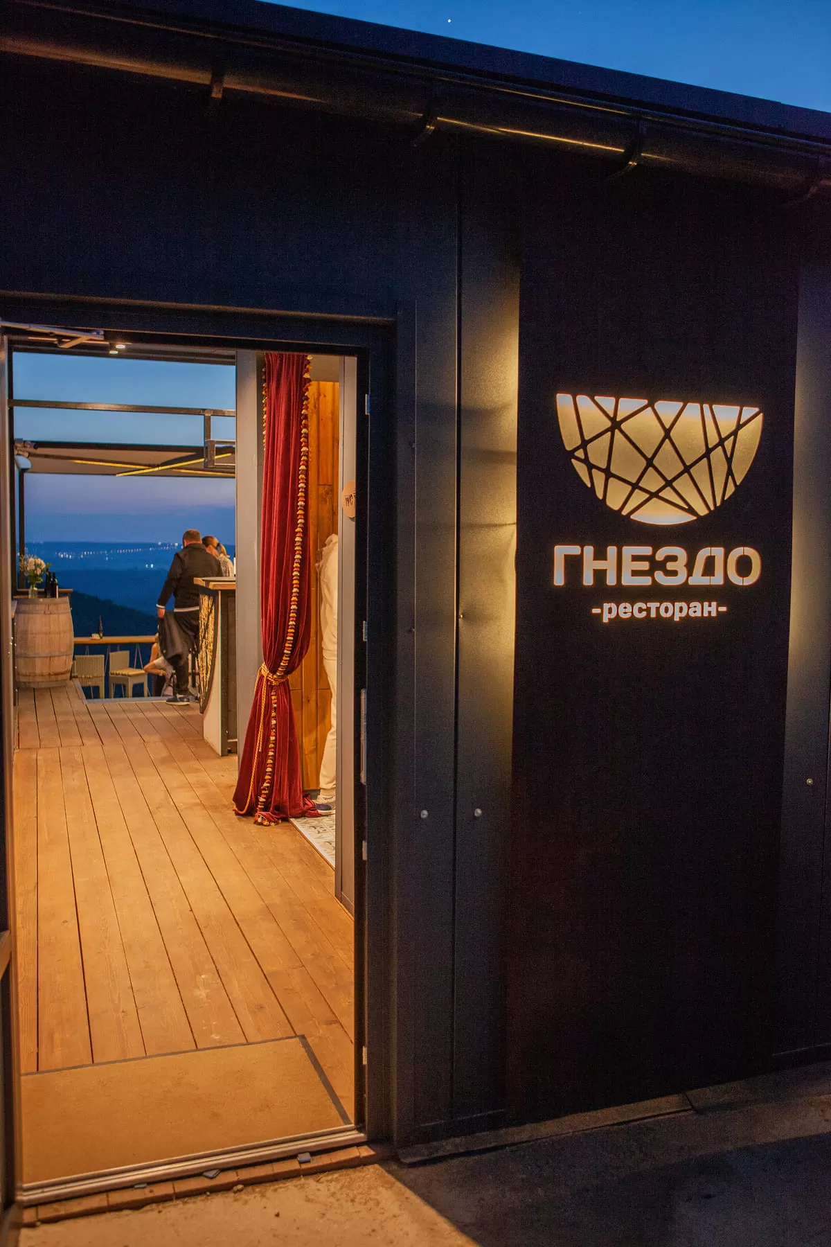 Ресторан представляет собой открытую террасу, откуда открываются невероятные виды на виноградники, горы и море. Ресторан «Гнездо» специализируется на эногастрономических ужинах с авторскими винодельнями региона.